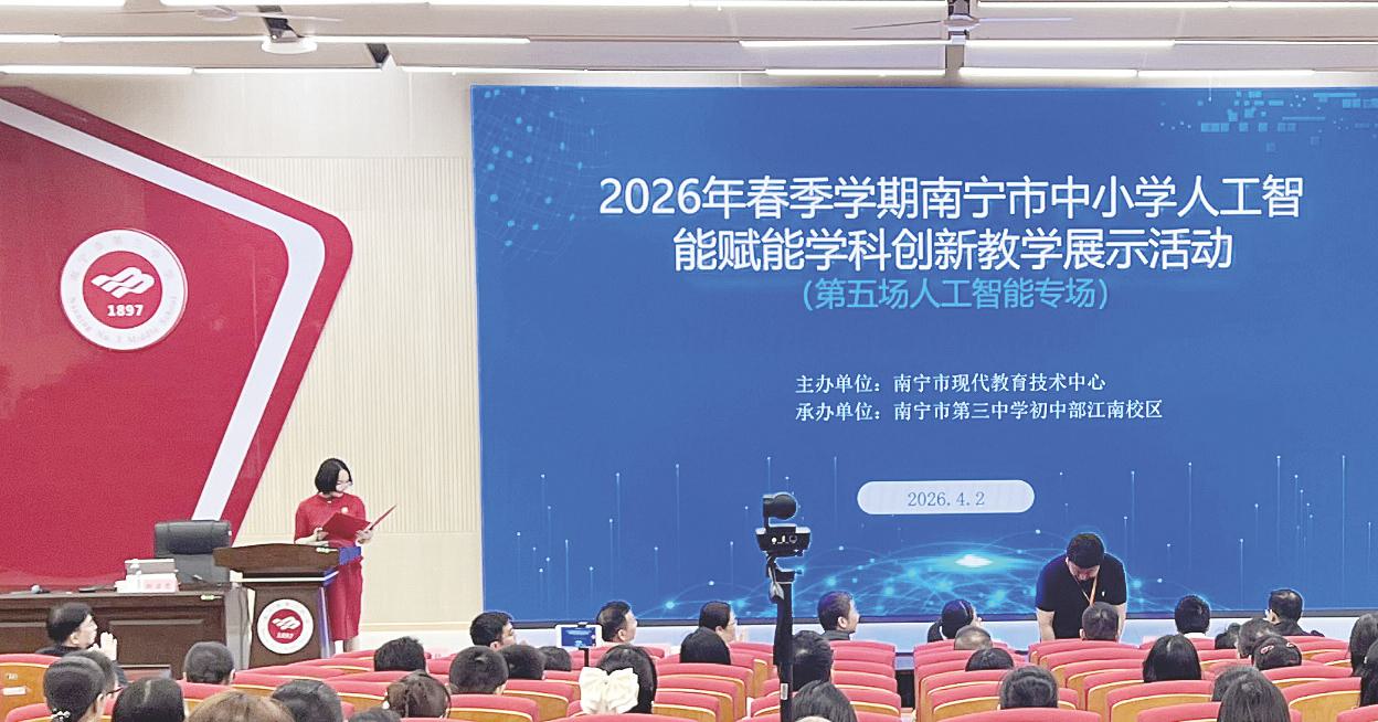 本报讯(记者陆增安 通讯员卢定先)为深入推进数字化赋能教师发展,探索人工智能与学科教学深度融合新路径,4月2日,由南宁市现代教育技术中心主办的2026年春季学期南宁市中小学人工智能赋能学科创新教学展示活动(第五场人工智能专场)在南宁市第三中学初中部江南校区举行。此次活动以“人工智能赋能学科创新教学”为主题,采用线下观摩与线上直播相结合的方式,吸引300余名教师代表现场参与,同时通过线上同步直播覆盖了更广泛的教育工作者。